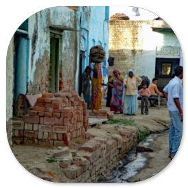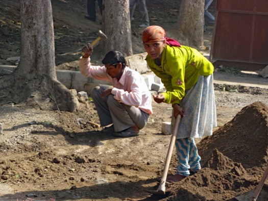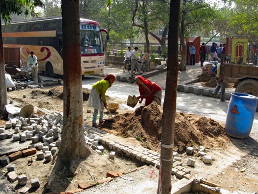 Alles sieht sehr erbärmlich aus. Auf der Fahrt durch die Straßen Delhis begegnen wir immer wieder Frauen beim Straßenbau. Nicht nur, dass neben den Straßen überall Schuttplätze und Müllhaufen sind - nein, es sind fast alles irgendwie Baustellen. Ganz Delhi ist eine Baustelle: Überall wird irgendetwas ausgeschachtet, abgedichtet oder repariert. Dort arbeiten dann auch viele Frauen, was in unseren Augen sehr ungewöhnlich ist. Das Schlimmste aber ist, dass alles ohne Baumaschinen abläuft: Keine Betonmischmaschinen, keine Radlader, selten eine Schubkarre oder eine Rüttelmaschine. Die Frauen tragen den angemischten Beton in Körben auf dem Kopf und entleeren die Körbe in die Baugrube.