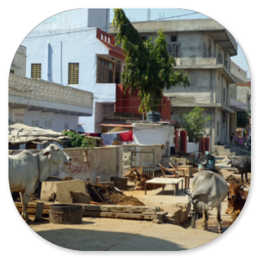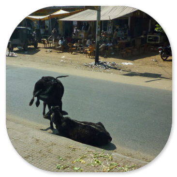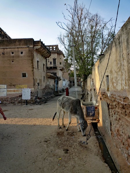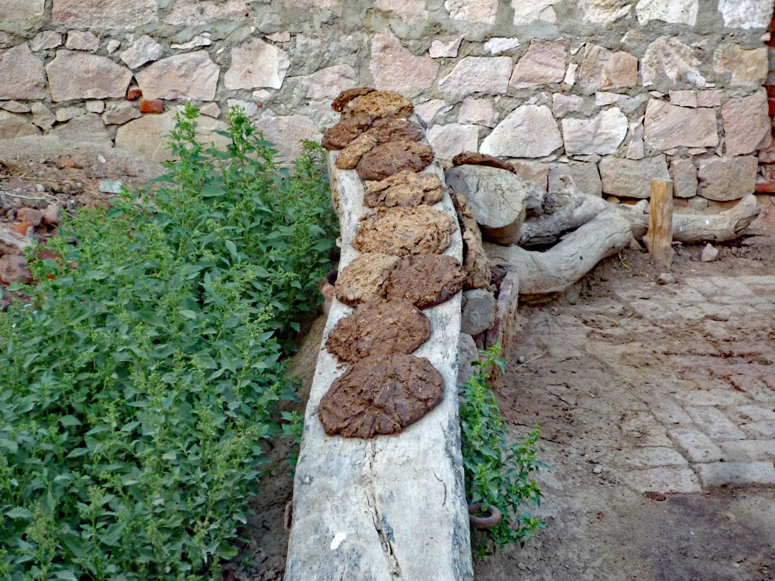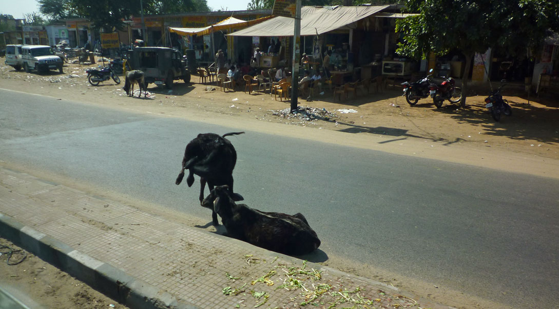 Die Kühe sind allerdings ein Völkchen für sich. Kühe grasen in Indien nicht auf der Weide, sondern im Schutt neben der Straße, weil dort genug Müll zu finden ist, von dem sie sich ernähren können. Meist sind sie angebunden, damit sie nicht weglaufen können und ihre Haufen dort hinterlassen, wo man sie direkt auffegen kann. Schließlich sind Kuhfladen wertvolles Brennmaterial, das sich gut verkaufen lässt. In der Mitte zwischen zwei Fahrbahnen bindet man sie nicht an, damit sie sich auf dem "Grünstreifen" frei bewegen können.