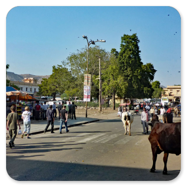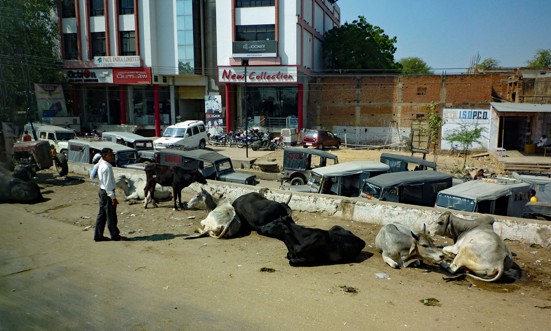 Wenn man also in eine Stadt hinein fährt, sieht die Situation so aus, dass man erstmal auf der Fahrbahn Kühe sieht und darum herum fährt, weil ja Linksverkehr herrscht. Der Gegenverkehr tut das auch und dann steht man sich gegenüber, weicht aus und das Spiel beginnt von vorn. Das ist sogar in Jaipur so, als wir in die Hauptstadt Rajasthans hineinfahren, die 3 Millionen Einwohner hat. Hier hat aber jemand eine Kuh angefahren und das blutende Bein ist gebrochen oder verletzt, sodass die Kuh nicht mehr aufstehen kann. Das berüht einen doch schmerzlich, wenn man sieht, wie das Tier leidet und keiner kümmert sich darum. Hier das Video: