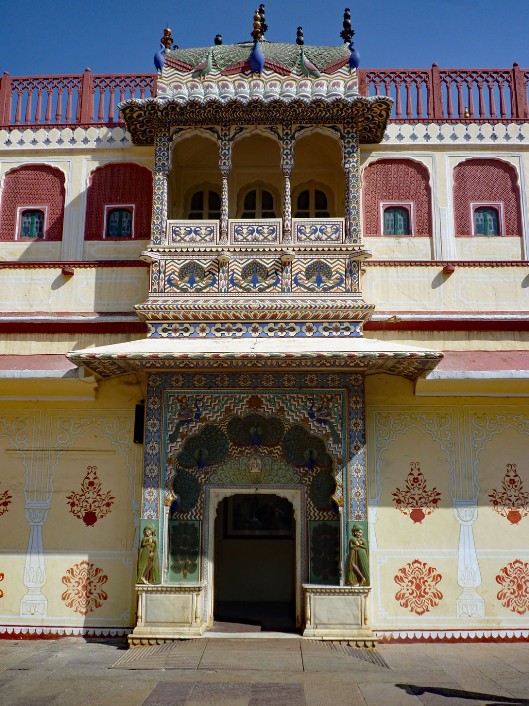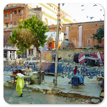 Da Tauben bei den Hindus fast so heilig wie Kühe sind, werden sie fleißig von ihnen gefüttert, weil das als gute Tat gilt, die sich positiv auf die Wiedergeburt und das nächste Leben auswirkt. Dass die Vögel aber mit ihrem Kot den gesamten Sandstein, aus dem die Moschee gebaut ist, konsequent zerstören, stört halt keinen, sondern nur uns unwissende Touristen aus Europa.