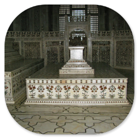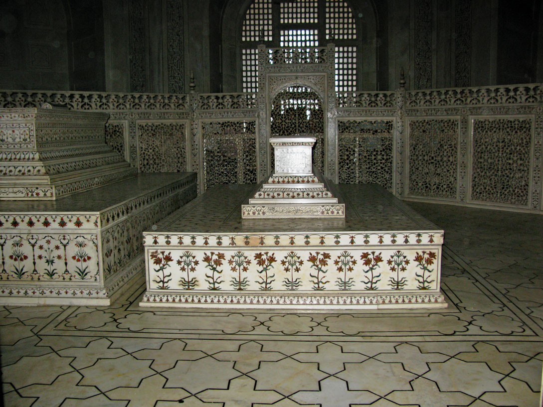 Das riesige Mausoleum ist 1631 auf einer 5m hohen und 100x100m großen Marmorplattform errichtet worden zu Ehren der Lieblingsfrau des Großmoguls, mit der er 18 Jahre verheiratet war und die ihm 14 Kinder gebar. Bei der Geburt ihres 14. Kindes ist sie gestorben. 20000 Handwerker und mehr als 1000 Elefanten haben 17 Jahre an dem Bau gearbeitet. Von Acay hören wir die tränenreiche Geschichte und die Legenden, die sich um dieses Bauwerk ranken. Als ausländische Besucher haben wir am Ticketschalter jeder eine Flasche Wasser und ein paar Überzüge bekommen, sodass wir die Schuhe nicht ausziehen müssen, um ins Innere zu kommen. Dort ist das Fotografieren streng verboten und wir erhaschen einen Blick vom Sarkophag, der mit Tausenden von Edelsteinen geschmückt ist, die als Intarsienarbeit in den Marmor eingelegt sind. Dank meiner kleinen digitalen Lumix kann ich ein Bild davon zeigen. Der Schrein in der Mitte ist von der Ehefrau, der größere Schrein links, der die ursprüngliche Symmetrie zerstört, ist vom Großmogul selbst, der später (1666) neben seiner Frau beerdigt wurde.