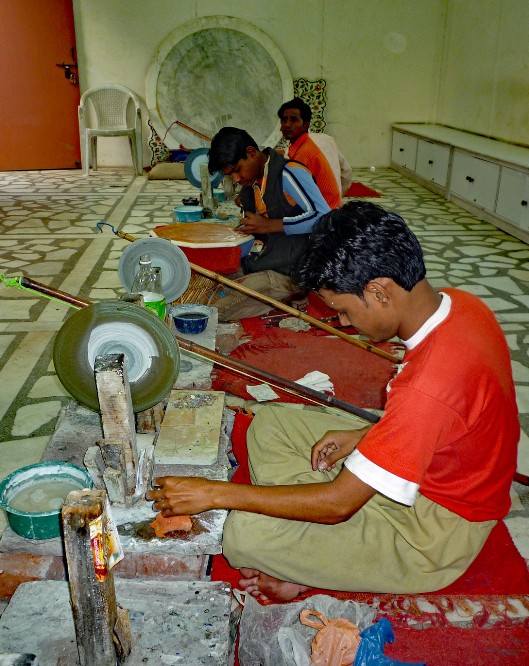 Anschließend fahren wir ins Hotel Clark´s Shiraz Agra, das uns gut gefällt, weil es so wie das Jaipur ist. Nach einer Stunde Ruhepause treffen wir uns zu einer Fahrt in die Intarsien-Werkstatt, die die Edelsteine schleift und in verschiedene Marmorplatten einbaut. Durch die Arbeiten am Taj Mahal hat sich eine uralte