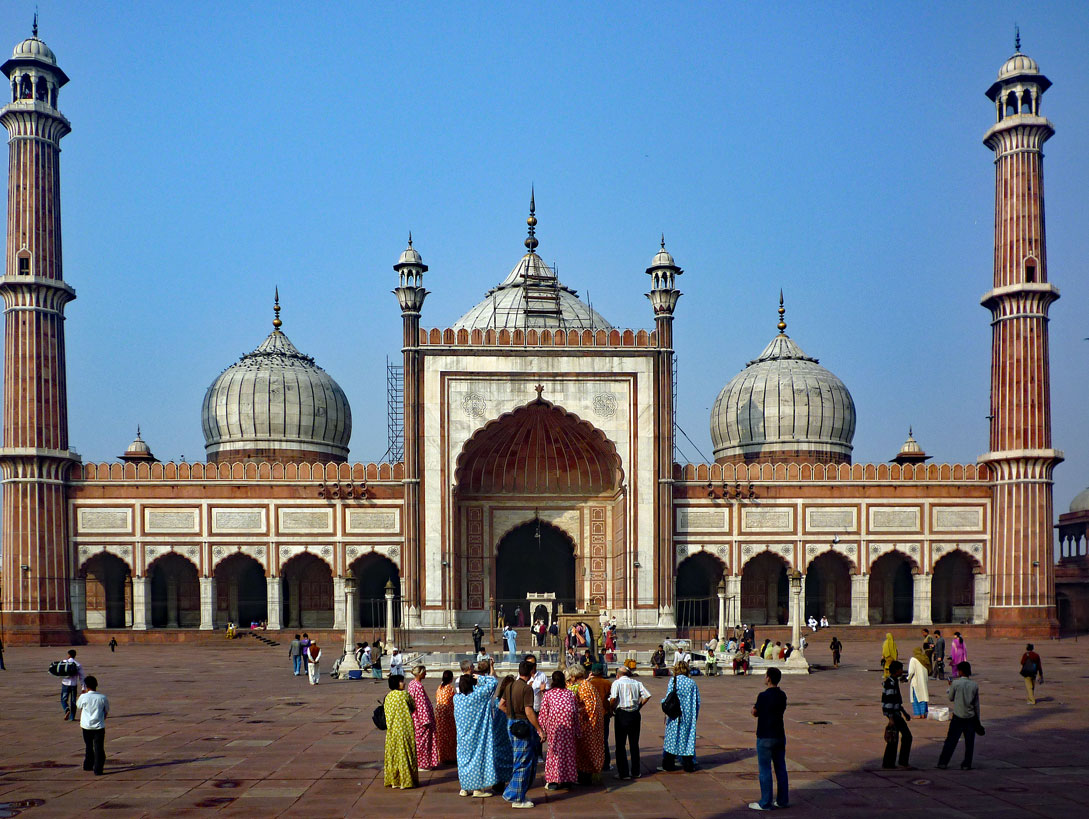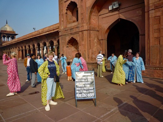 Unsere Besichtigung beginnt mit der Jama Masjid, der Freitags-Moschee in der Altstadt, die die größte Moschee Indiens ist. Der monumentale Bau von 1650 befindet sich auf einem Hügel in der Altstadt Delhis. Die Frauen bekommen alle einen Umhang, weil es nicht schicklich ist, nackte Beine zu zeigen. Das gilt als "sexy", während ein nackter Bauch erlaubt ist. Tja, andere Länder, andere Sitten! Auch für einen solchen Ausleih-Umhang muss man natürlich 50 Rupien blechen (60 Rupien sind 1€).