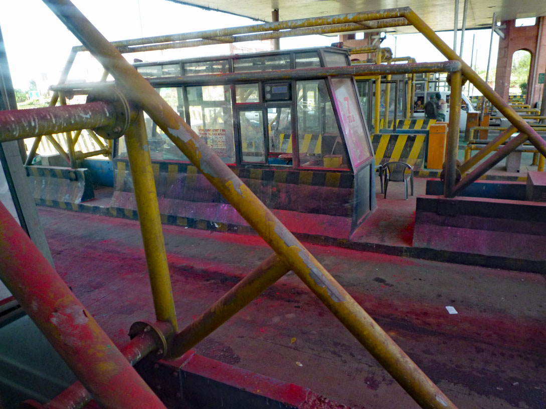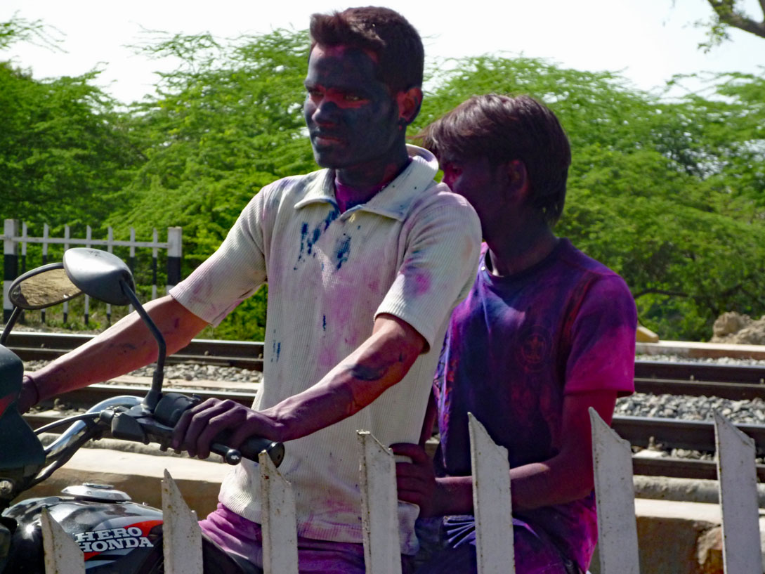 Unterwegs begegneten uns natürlich viele angemalte oder besprühte Holi-Fans, die auch nicht immer nüchtern waren. Als wir dann auf der Schnellstraße waren und die erste Zahlstelle passierten, sahen wir, wie mitgenommen die Kabinen der Kontrolleure waren, die dort die Maut kassierten.