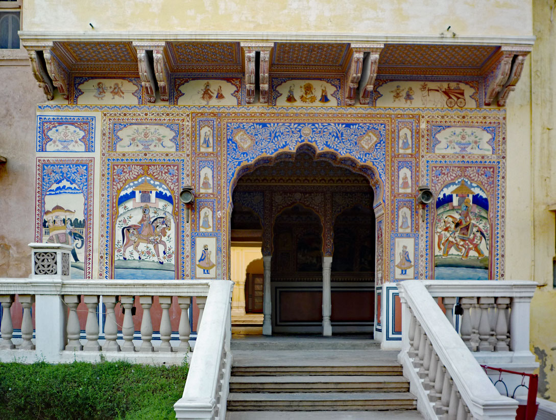 Unser Reiseführer Acay schildert den Ort als "art gallery in the desert", weil die Karawanen auf dem Weg von China zum Kaiberpass hier entlang kamen und sich daraus ein Handelsschwerpunkt entwickelte. Die Kaufleute sind im Mittelalter alle zu großem Reichtum gekommen und haben sich tolle Häuser und Paläste mit schönen Ornamenten, Fresken und Mosaiken geleistet, die als "Havelis" bezeichnet werden. Diese prächtigen alten Kaufmannshäuser werden heute wieder aufpoliert, sind aber blass und haben ihren alten Glanz völlig verloren. Lediglich am Eingang des Palasthotels sind noch farbige Fresken zu sehen, deren Farben einigermaßen leuchten.