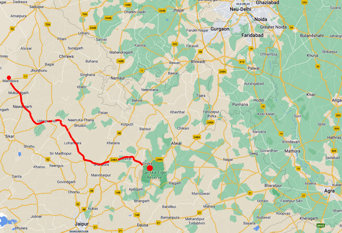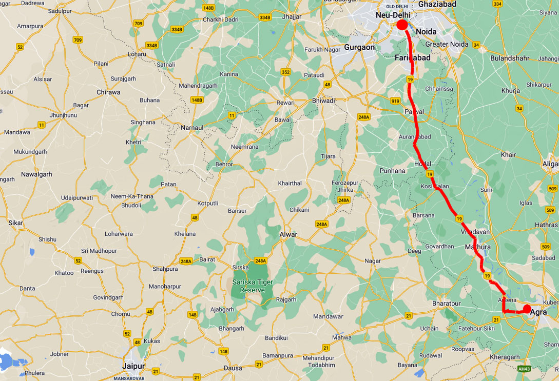 Unser erstes Ziel auf der Fahrt durch Rajasthan ist Sariska, das etwa 200 km südwestlich von Delhi liegt. Um 14:00 geht es los und die Fahrt soll 5 Stunden dauern.