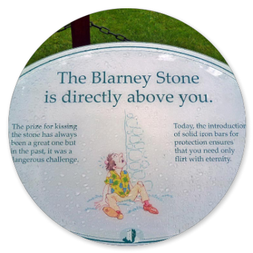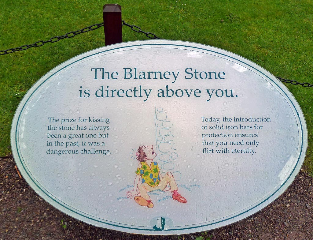 Morgens beim Frühstück haben wir uns wieder zu früh gefreut, als es nicht regnete. Es regnet nämlich in Strömen, als wir in Blarney Castle aussteigen und einen Spaziergang durch den Schlosspark machen. Wir klettern durch die engen Felsentreppen auf den moosbewachsenen Turm und schauen uns den Stein an, den man küssen soll, damit man besser reden kann. Der ist ganz blank vom Küssen und feucht und nass heute. Trotzdem küssen ihn viele Leute und bezahlen 3 Euro für das Foto, das der Fotograf unter der Regenplane macht. Hier unsere Eindrücke: