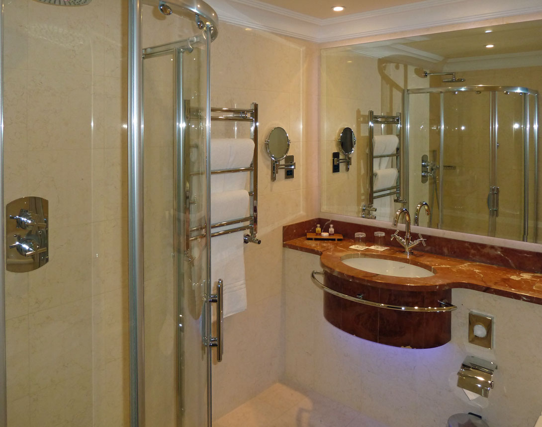 Für exklusive Gäste, die nicht zur Gruppe gehören, gibt es natürlich ein richtiges Frühstücksbuffet mit allem Drum und Dran. Ein Express-Frühstück kostet 7,50 €, ein Irish Breakfast 12,50 und für ein richtiges amerikanisches Frühstück muss man jedes Item extra zahlen: für die Hackfleischbällchen 1,65, das Spiegelei 1,35, die Miniwürstchen 1,95 usw. Alles zusammen kommt das locker auf 20 €. So begnügen wir uns mit dem Gruppenfrühstück, das in unserem Reisepreis inbegriffen ist und sind gespannt, wie sich alles weiter entwickelt. Die Preise sind jedenfalls gesalzen, was man von dem Essen nicht behaupten kann.
