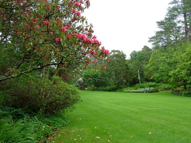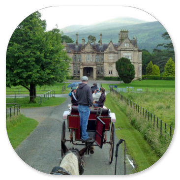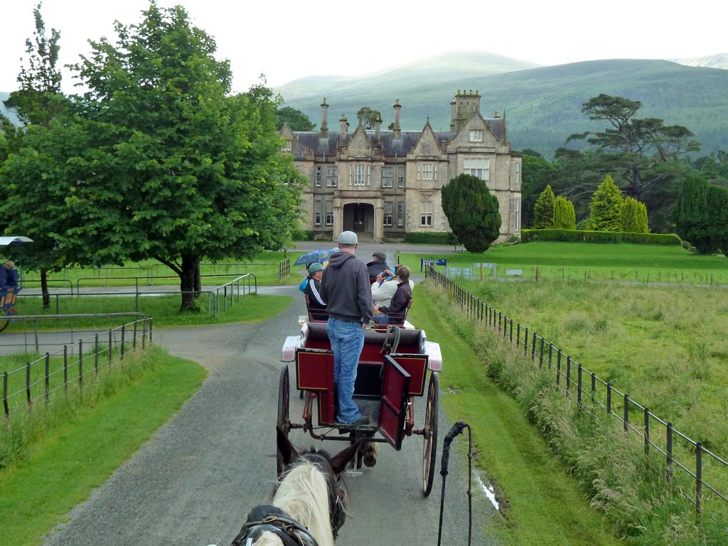 Als wir um 7:15 Uhr frühstücken, sehen wir zum ersten Mal auf unserer Rundreise ein paar blaue Flecken am Himmel, aber die Straßen haben große Pfützen. Es muss in der Nacht stark geregnet haben. Die blass-blauen Stellen am Himmel lassen uns hoffen, denn wir wollen heute den Ring of Kerry fahren. Die 200 km lange Panoramastrecke soll zu den schönsten Stücken Irlands gehören, deshalb sind wir sehr gespannt darauf. Der Bus fährt von Killarney los in den Nationalpark. Als wir am Eingang von Muckross Gardens auf die Kutschen aufsteigen, regnet es schon wieder. Die Schauer verderben uns die ganze Fahrt durch den Schlosspark. Schade, dass die Rhododendronbüsche - und bäume keine Blüten mehr haben und dass die Sonne nicht scheint, sonst wäre das wirklich schön hier!