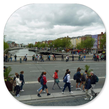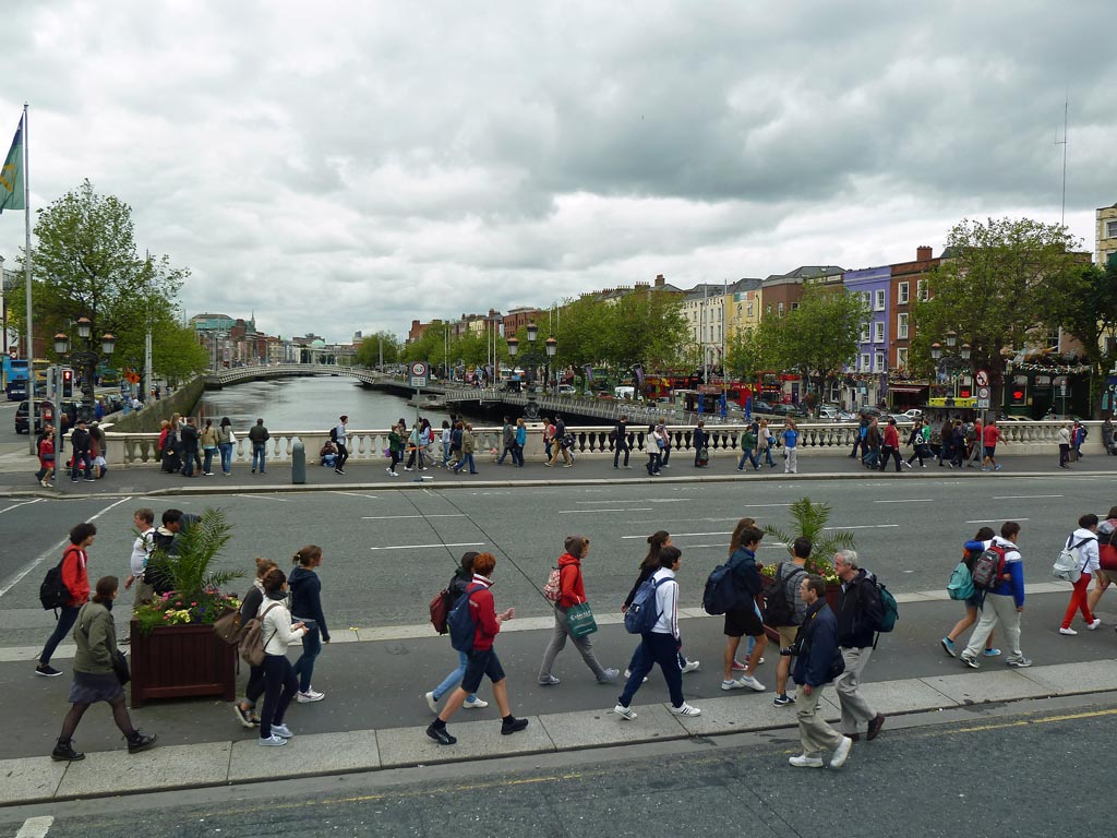 Wir bestaunen den Spire, die 120m hohe glitzernde Metallnadel, die als Wahrzeichen auf der Kreuzung steht. Man kann diese "Needle" auf dem Foto im Hintergrund sehen, das ich von der O´Connell-Bridge aus gemacht habe. Beim Spaziergang durch die Fußgängerzone fallen uns die vielen jungen Menschen auf und vor allem die vielen Mütter mit Kinderwagen. Das ist toll und das haben wir bisher noch nirgends so beobachten können. Hier ein kurzer Videoeindruck davon: