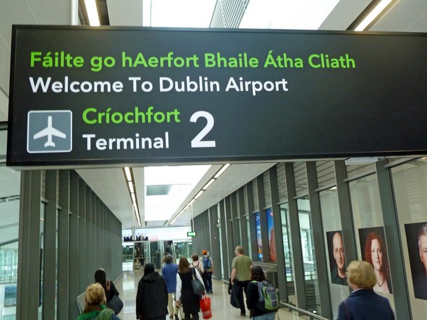 Hier ist es 16 Grad, eine Stunde früher und nur wenig bewölkt. Das stimmt uns schon einmal positiv. Im Flughafen werden wir auf Gälisch und Englisch begrüßt (alle Schilder sind zweisprachig, weil Gälisch Amtssprache ist). Das ist ganz witzig. Es erwartet uns eine Reiseführerin, die mit uns vor dem Terminal erstmal 600 m durch verschiedene Glasgänge marschiert bis zum Parkplatz der Hotelshuttles, die hier im 15 Minutentakt 24 Stunden am Tag die Fluggäste in die Hotels bringen. Ich weiß gar nicht, was Leute machen, die keine Rollen unter den Koffern haben...