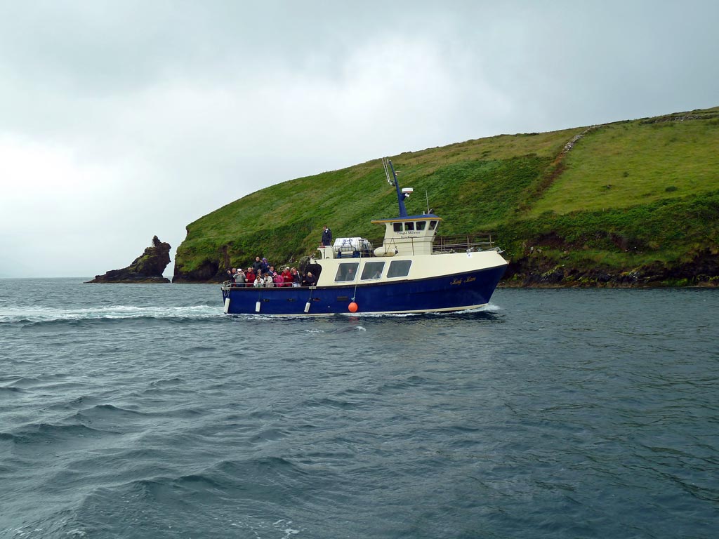 Für 14 € kann man eine Rundfahrt durch die Dingle-Bucht machen. Es ist verflixt ungemütlich auf dem kleinen Boot, das durch die Bucht kreuzt, nur um den Delphin Fungie aufzustöbern, der sich hier seit 29 Jahren aufhält. Wir sehen ihn tatsächlich, aber die Digitalcameras aller Leute sind zu lahm: Jedesmal, wenn er auftaucht und irgendjemand "Da ist er!" ruft, schauen alle hin und bevor die Auslöser gedrückt sind, ist er wieder abgetaucht.
