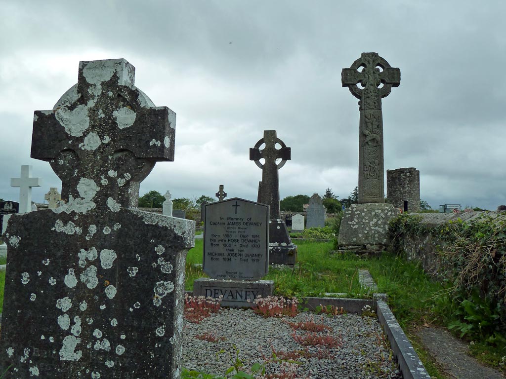 Die Sprüche von ihm sind zwar ganz nett, aber das Grab ist kümmerlich. Bemerkenswerter finden wir die großen keltischen Kreuze, die überall über den Gräbern aufragen. Es sind interessante Sprüche und gemeißelte Figuren darauf.