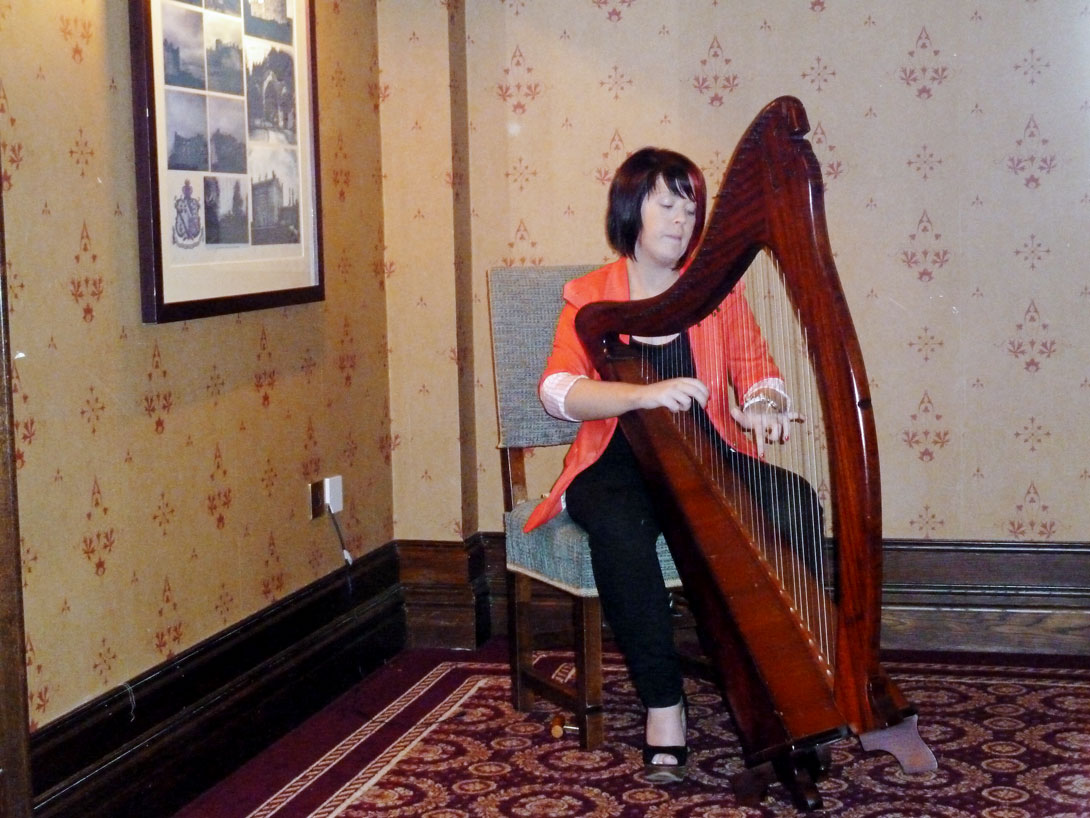 Beim Abendessen merken wir natürlich schnell, dass alles nicht für uns ist. Der schön gedeckte Speisesaal ist für eine Hochzeitsgesellschaft vorgesehen, während unsere Reisegruppe in einem engen Nebenraum gesondert mit einem Touristenmenü abgefüttert wird. Immerhin dürfen wir dazu auf roten Sesseln mit Wappen sitzen, mit Wappen bedruckte Servietten auf unseren Schoß legen und schwerstes Silberbesteck zum Essen benutzen. Auch Kaffee oder Tee wird aus gewichtigen Silberkannen serviert. Das gefällt uns schon, wenn auch das Glas Heineken 5,30 Euro und das Glas Wein 6,70 Euro kostet. Anschließend spielt in der Dungeon Bar im Keller eine Irin auf der Harfe.