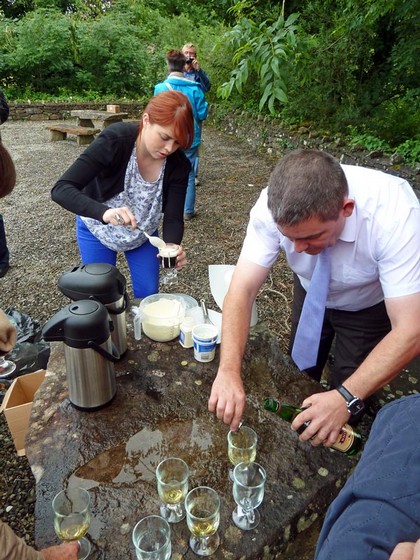 Natürlich lachen wir alle - vor allem auch deshalb, weil wir vorher noch einen selbst gemachten Irish-Coffee von Kevin und Catherine getrunken haben, den sie auf einem Parkplatz am Fluss von Inistioge gebraut haben.