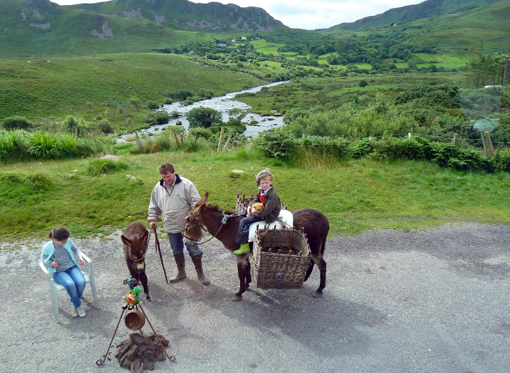 Der Busfahrer fährt die Rundstrecke entgegen dem Uhrzeigersinn, was sich sehr schnell als schlau erweist, weil er andersherum immer am Abgrund sitzt und den entgegenkommenden Fahrzeugen nicht ausweichen kann. Unterwegs stehen irische Bauern mit Kindern und Eseln an der Straße und verlangen ein Trinkgeld, wenn sie fotografiert werden wollen.