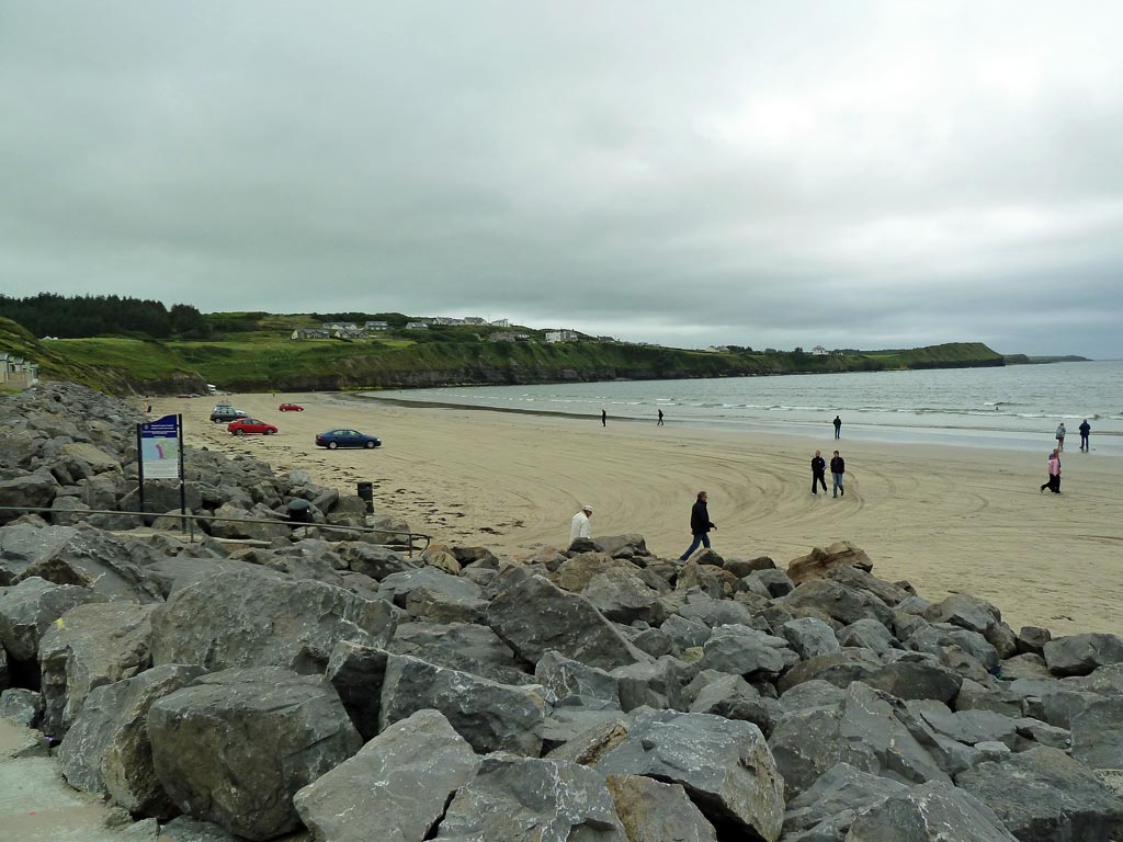 Der Stewart macht einen hervorragenden Irish Coffee. Der wärmt innerlich und macht alle Leute feuchtfröhlich, sodass das gesamte Boot nach einer Stunde Fahrt kräftig mitsingt, als der Alleinunterhalter (hauptamtlich Manager des Viehmarktes) irische Shanties anstimmt. Die Inselwelt ringsum ist nicht aufregend, immerhin begleiten uns ein paar Seehunde. Bemerkenswert ist nur der hohe Unterschied zwischen Ebbe und Flut von 4,50 m. Den sehen wir auch am Mittag, als wir durch die Grafschaft Sligo fahren und am weiten und menschenleeren Rossnowlagh-Beach eintreffen, wo viele Iren zum Surfen hinfahren.