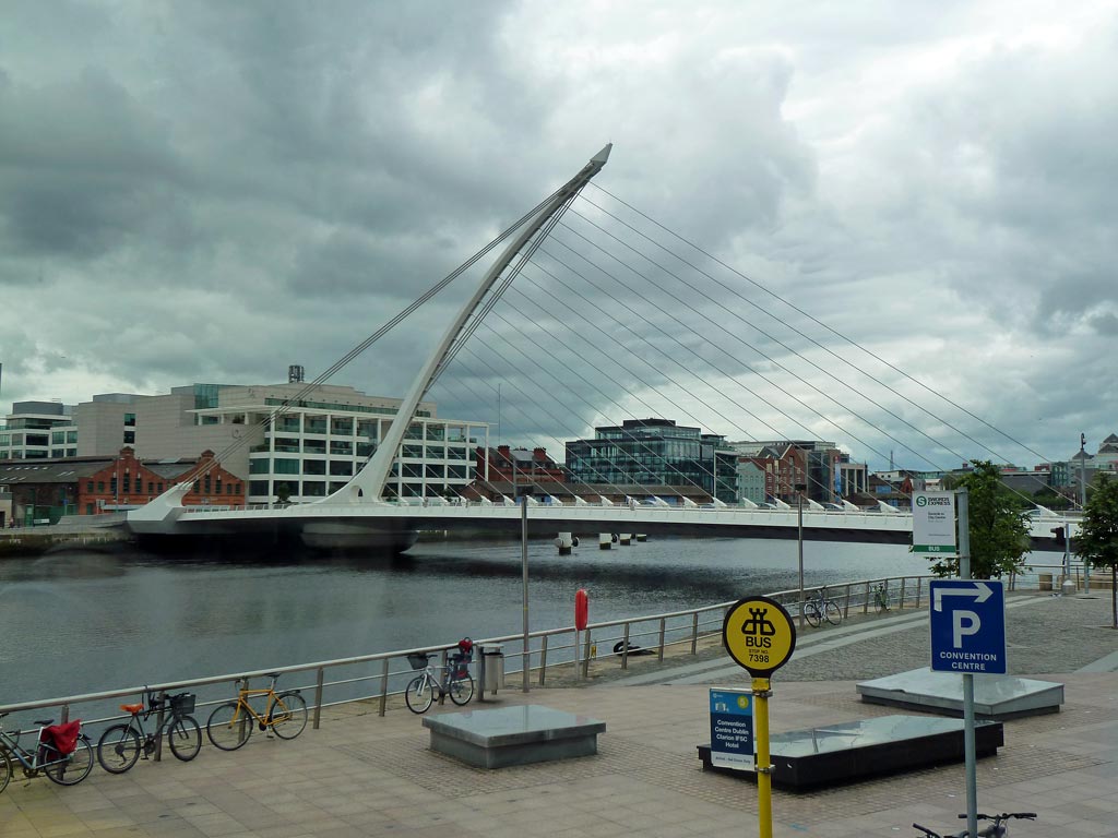 Stark beeindruckt sind wir von der Samuel Beckett Brücke, die wie eine große Harfe aussieht und mit mächtigen blitzenden Stahlseilen den Liffey River überspannt. Das Besondere an ihr ist, dass sie um 90° gedreht werden kann, um Schiffe durchzulassen.