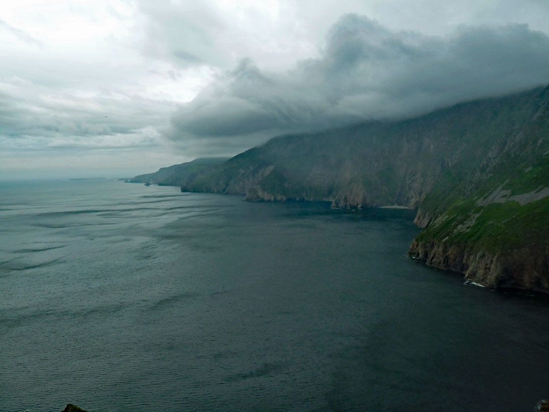 Regenwolken hängen über Slieve League, aber bei schönem Wetter müssen die Steilhänge atemberaubend sein.