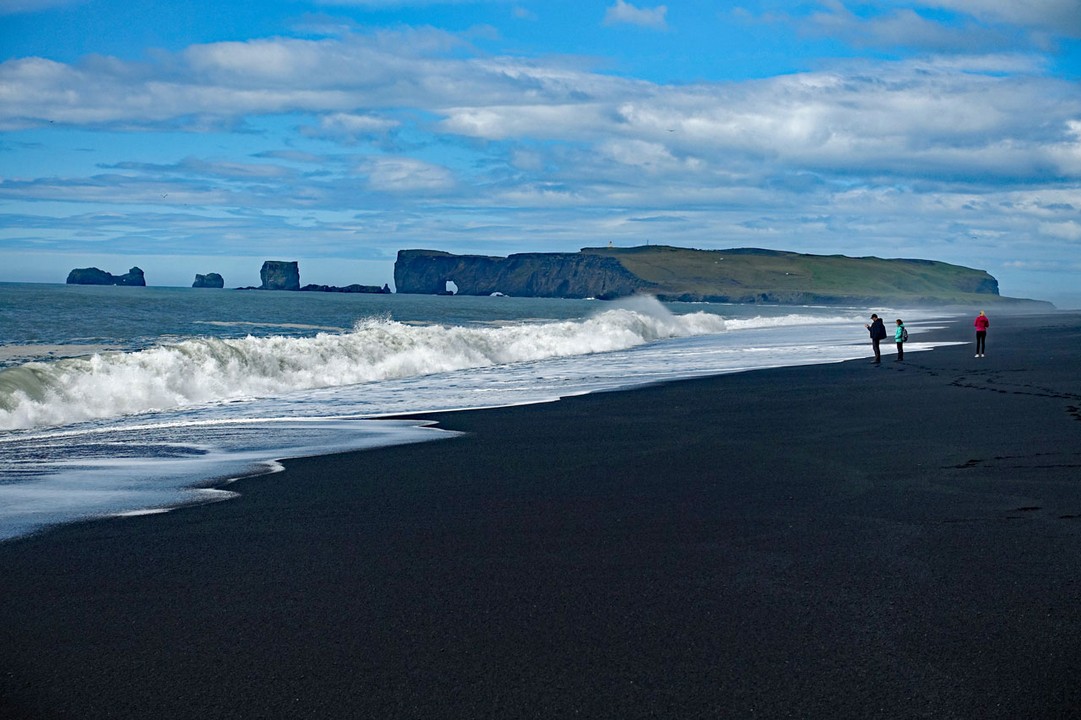 Der Strand ist wirklich schwarz. Auf der anderen Seite blickt man auf das Kap Dyrholaey mit dem Felsentor. Die 120 m hohe "Türhügelinsel" ist bei einem früheren Vulkanausbruch entstanden. Heute ist die Insel verlandet und zu einem Kap geworden. Durch das Felsentor kann man mit einem Boot hindurchfahren.