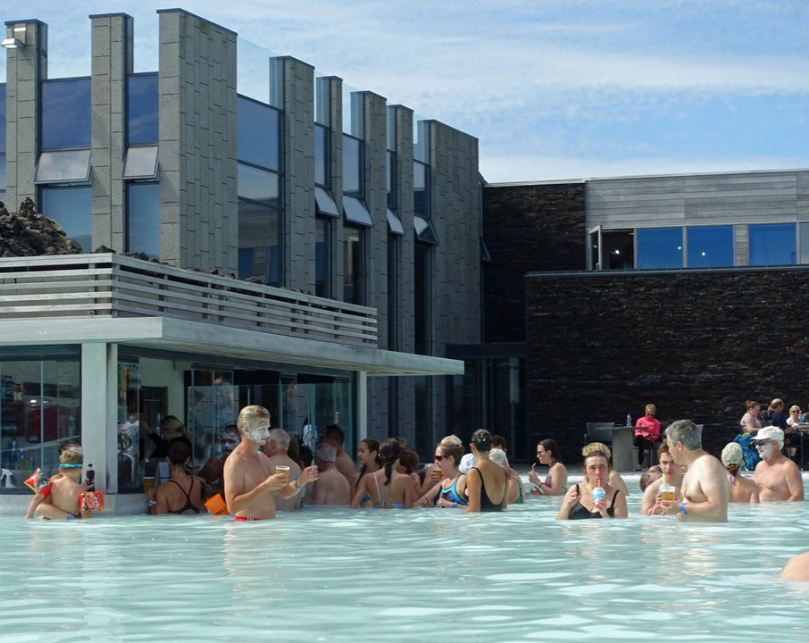 Dafür bekommt man dann ein Handtuch und ein Armband mit einem Chip, der für alles verwendet wird: Man kommt mit ihm durch die Sperre, kann damit einen Spind im Umkleideraum öffnen und schließen oder in der Poolbar bezahlen. Alles wird in dem Chip gespeichert und wenn man die Blaue Lagune verlassen will, muss man ihn in eine Ladeschale an der Sperre legen. Die gibt den Durchgang erst frei, wenn alle Rechnungen beglichen sind. Es ist gut, dass viele Sicherheitskräfte und Helfer hier arbeiten, die den vielen Touristen und uns die Funktion der Schließfächer und das nackte Duschen erklären. Innen sieht man zwar schon den Massenbetrieb, aber es gibt genügend Umkleideräume und man hat genügend Platz. Verwirrung entsteht bei unserer Gruppe dennoch, weil manche Kleiderspinde in verschiedenen Bereichen die gleichen Nummern tragen.
