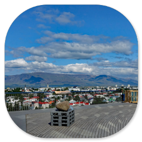 Das Angebot nehmen wir gerne an und erhoffen uns einige schöne Ausblicke von der Glaskuppel. Das 25 m hohe Gebäude besteht aus 6 Warmwassertanks, die aus verschiedenen Bohrlöchern mit 85°C heißem Wasser gespeist werden und zur Versorgung von Reykjavik mit heißem Wasser dienen. Auf diese Wassertanks wurde eine Glaskuppel gesetzt, in deren oberster Etage sich ein Drehrestaurant befindet. Das ist zwar ziemlich teuer, aber so hat man abends und in der Nacht natürlich einen fantastischen Blick auf den Himmel und während der Wintermonate auf die Polarlichter.Im Gegensatz zu unserem letzten Besuch ist heute schönes Wetter und nach einem Cappuccino mit einem Stück Kuchen ( - über die Kosten von 30 Euro schauen wir großzügig hinweg - ) betrachten wir die Stadt Reykjavik von der Aussichtsplattform aus: