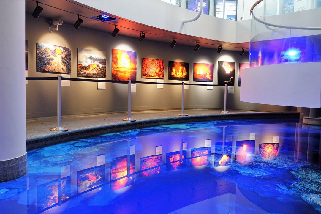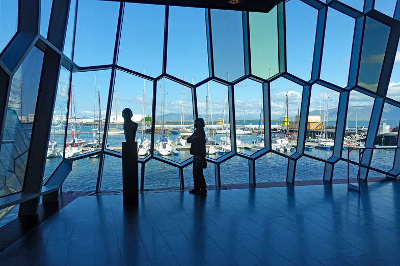 Das Gebäude ist schon beeindruckend, wenn man im Innern die Treppen hinauf- oder hinuntersteigt oder die einzelnen Konzertsäle sieht. Wir spazieren durch das Gebäude und steigen an vielen unterschiedlichen Treppenaufgängen hinauf oder hinunter. Die Wirkung des Lichts hinter den Glasbausteinen ist überall anders und man muss sich einfach die Zeit nehmen, dies zu bewundern. Natürlich ist alles ziemlich touristisch aufgemacht und neben den Blumenläden und Cafés gibt es viele Geschäfte mit Souvenirs. Die sind allerdings sehr schön und gut ausgewählt. Viele Touristen sind begeistert von der isländischen Kunstkultur und kaufen entsprechend ein. Zu bestimmten Zeiten kann man an einer Führung teilnehmen, aber wir verzichten darauf und buchen zwei Tickets für einen Film im Keller über die Wunderwelt Islands. Der ist leider ziemlich enttäuschend, denn die Projektion auf alle vier Wände des Kinos ist einerseits schwierig anzuschauen und andererseits ist die Beleuchtung zu schwach, um wirklich die Farben leuchtend darzustellen. Schade.