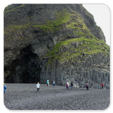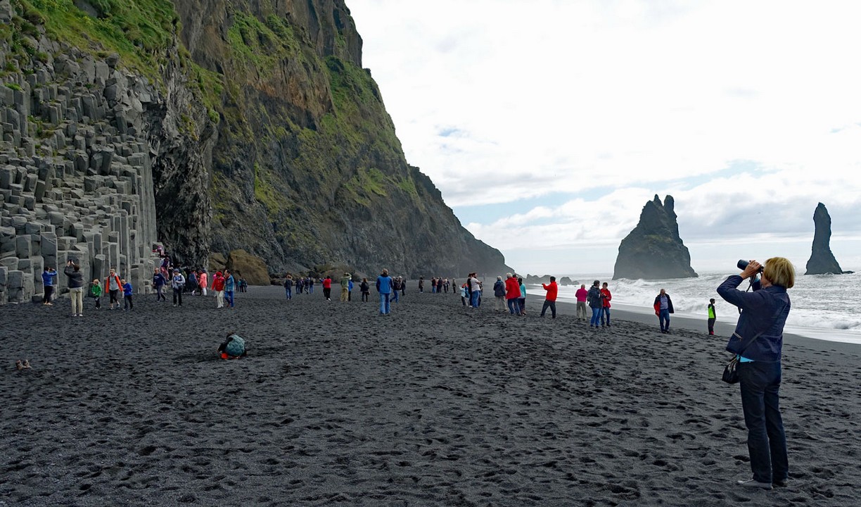Unsere Fahrt geht weiter zum Black Sand Beach bei Reynisfjara, wo die Vulkane säulenförmige Basaltstrukturen hinterlassen haben. Seeschwalben nisten in der Höhe und umschwirren die Touristen, aber die Höhlen der Papageientaucher zwischen den Steinen am Strand können wir trotz Fernglas nicht entdecken.
