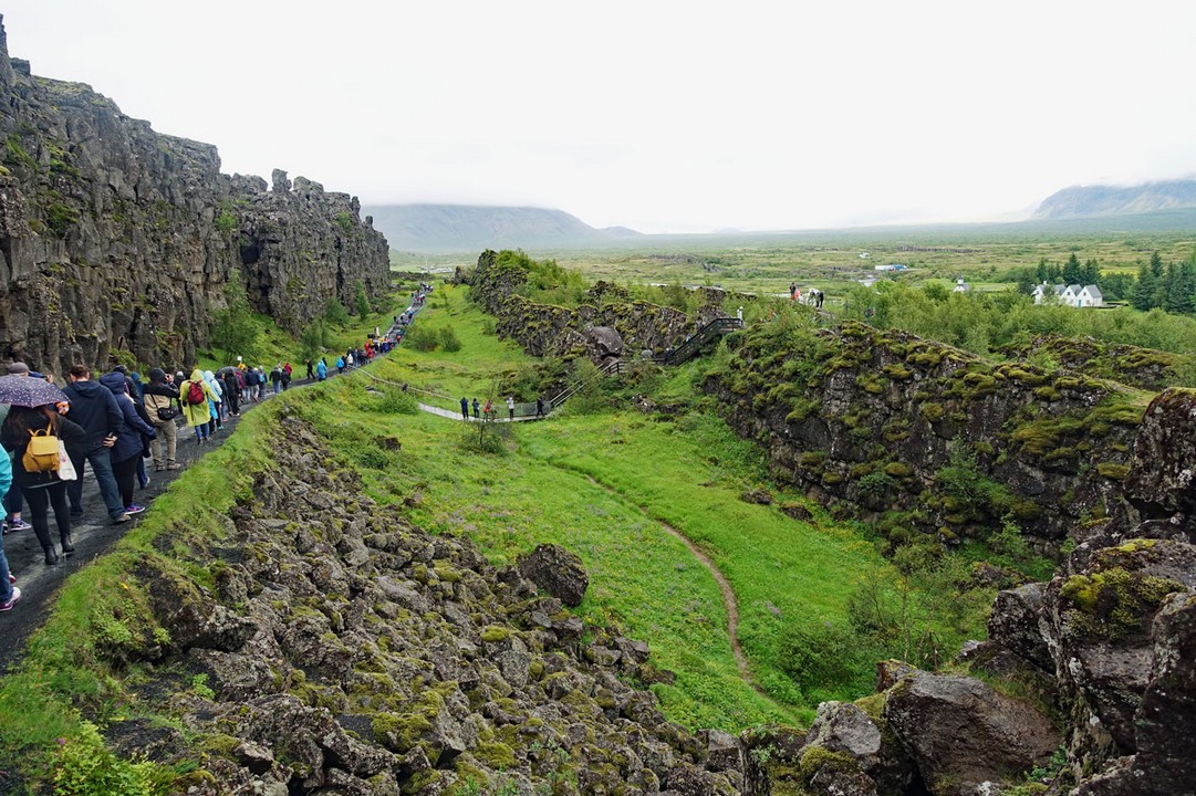 Wie auf dem oberen Bild zu sehen ist, zieht ein großer Bruchgraben durch dieses Gebiet. Durch den ziehen an diesem Tag mehrere Tausend Touristen, wie auf dem Bild zu sehen ist. Das hängt auch damit zusammen, dass gerade ein Kreuzfahrtschiff im Hafen liegt und die meisten Passagiere den "Golden Circle" als Ausflugsprogramm buchen, weil der ja die drei Highlights der Insel umfasst. Und schließlich ist der Thingvellir-See mit der Schlucht das erste Highlight.