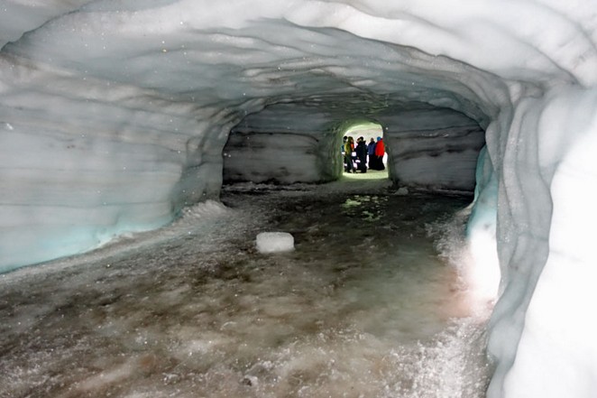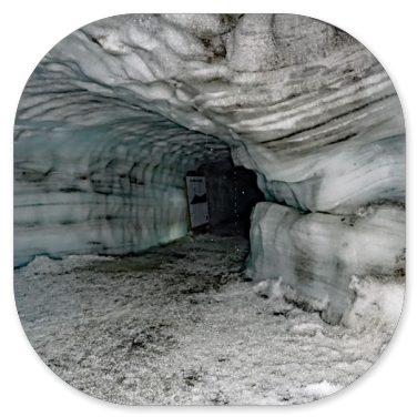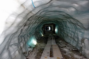 Das Gletschermobil bewältigt die Strecke vom Basislager, das in 800 m Höhe liegt, bis zum Eingang des Tunnels in 1400 m in etwas mehr als 20 Minuten. Die Firma hat zu Forschungszwecken (und natürlich als Touristenattraktion) einen 550 m langen Tunnel in die Eisschicht gebohrt, der bis in eine Tiefe von 40 m führt. Während draußen jetzt hier oben eine Temperatur von etwa 5° C herrscht, ist es im Tunnel ganzjährig um die 0°Celsius.