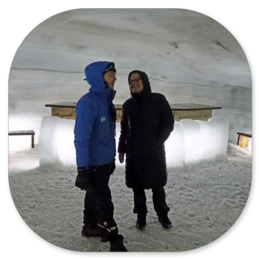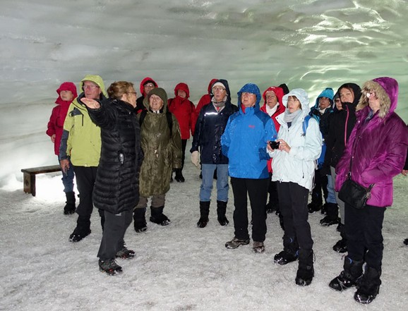 1 1/2 Stunden spazieren wir in verschiedenen Gängen und Tiefen durch den Gletscher. Es ist kalt und nass. Manchmal hört man kein Echo, weil viel Luft in der Harsch-Schicht enthalten ist. An anderen Stellen ist das Eis dicht und ohne eingeschlossene Luftblasen. Dann hallt unsere Stimme dort deutlich. Zum Schluss sind wir froh, dass wir wieder ans Tageslicht kommen, weil wir ganz schön durchgefroren sind.