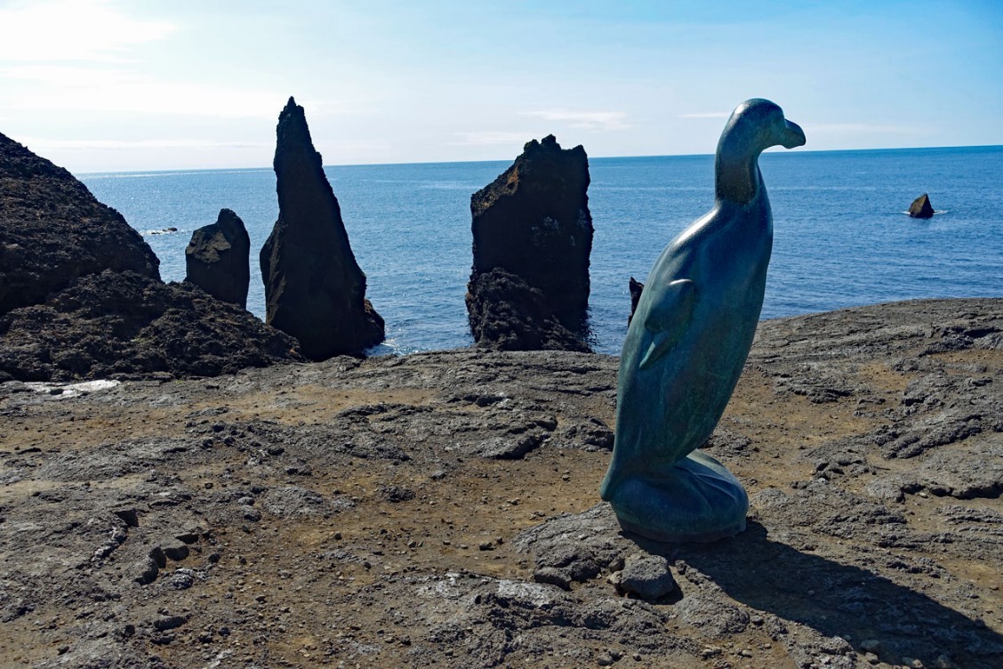 Die Landschaft hier ist karg; nur Moose und Flechten haben sich auf der Lava angesiedelt, denn durch die starken Winde und Stürme gedeiht hier sonst nichts. Hinter dem Leuchtturm ist eine pechschwarze Steilküste aus Lavabrocken und einem Denkmal für den letzten Alk. Dieser riesige Vogel war 5-6 kg schwer und sein Fleisch wohlschmeckend. Deshalb wurde er natürlich von den nordischen Völkern schon seit dem Mittelalter gejagt, was besonders leicht fiel, weil der nämlich wegen seiner fehlenden Flügel nicht fliegen konnte. Nachdem er schon in Kanada und Grönland ausgerottet war, wurden 1844 die letzten beiden Exemplare auf der Insel Eldey geschossen. Die Insel sieht man auf dem Foto weit draußen auf dem Meer. Zu Ehren des Vogels wurde eine Skulptur errichtet.