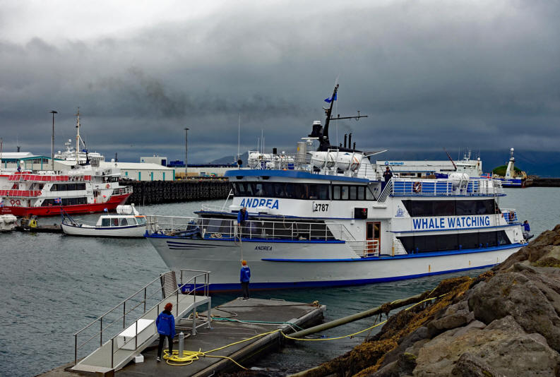 Das Walbeobachtungsboot "Andrea" startet mit etwas Verspätung. Wegen des schlechten Wetters sind nur 70 Personen an Bord, wodurch es viel Spielraum für Sitzplätze oben und unter Deck gibt. Das freut uns sehr. Die Tour wird von "Special Tours" durchgeführt und als "classic tour" bezeichnet. Sie kostet 10990 ISK, wenn man sie privat bucht. Die Sichtung von Walen wird garantiert; wenn man keine sieht, bekommt man Tickets für eine erneute Tour. Die Gesellschaft bietet noch viele andere Touren auf der Insel an. Wer sich dafür interessiert, sollte die Website https://specialtours.is/ besuchen.