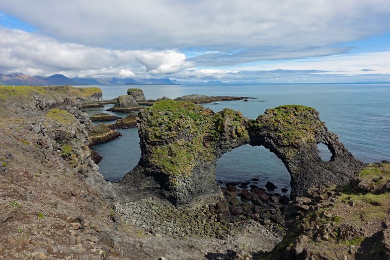 Hier steht auch eine Skulptur aus aufgeschichteten Steinen, die 1985 von dem Bildhauer Ragnar Kjrtansson zu Ehren von Bardur errichtet worden ist.Der Sage nach war Bardur einer der ersten Siedler hier in der Gegend um den Snaefellsjökull. Er ar aber größer und stärker als alle anderen, weil er Trollblut in seinen Adern hatte und die Zaubergabe hatte. Er neigte aber auch zu Berserkertaten und tötete seine Neffen, weil die nicht auf seine Tochter aufgepasst hatten. Schließlich verschwand er aber nach einem Kampf mit seinem Halbbruder im Snaefellsjökull und ward nie mehr gesehen. Die Isländer glauben, dass er noch heute dort lebt und verehren ihn als Schutzgeist.