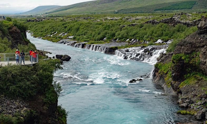 Der Barnafoss Wasserfall ist ein Wasserfall mit einer Länge von über einem Kilometer. Unzählige kleine und größere sprudelnde Quellen treten aus dem Berg hervor, der mit Büschen und Bäumen bewachsen ist. Eigentlich sind das keine Wasserfälle, wie man sich die normalerweise vorstellt. Vielmehr versickert der Fluss Hvíta etwas weiter oberhalb in einem ziemlich porösen Lavafeld, wird dann durch die verschiedenen Gesteinsschichten gefiltert und tritt anschließend als sauber geklärtes Wasser weiter unterhalb wieder aus dem Lavagestein auf einer Länge von mehr als 700 Metern aus. Das Wasser ist durch diesen Prozess so geklärt, dass es wunderbar blau aus dem Berg herauskommt.