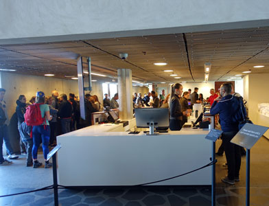 Hier zeigt sich natürlich wieder der Vorteil als Gruppe, dass man vorangemeldet ist und keine Wartezeiten in Kauf nehmen muss, denn die Warteschlange für die Privatnutzer an der anderen Seite der Kasse ist lang. Trotzdem geht alles sehr zügig, denn mit Hilfe von Computertechnik und durch die Vergabe von Terminen ist alles gut durchorganisiert.