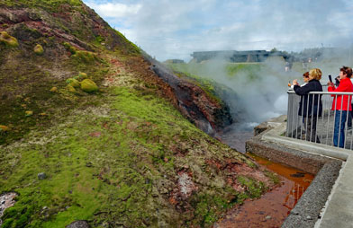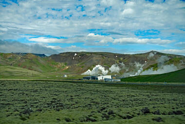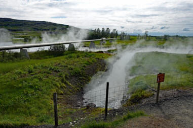 Um 15:15 Uhr machen wir uns auf den Rückweg, während uns unsere Reiseführerin Angelika etwas über die Landwirtschaft in Island erzählt. Den letzten Stopp machen wir an der Heißwasserquelle Deildartunguhver, die angebohrt wurde, um das 70 km entfernte Akranes und die umliegenden Dörfer mit heißem Wasser zu versorgen.