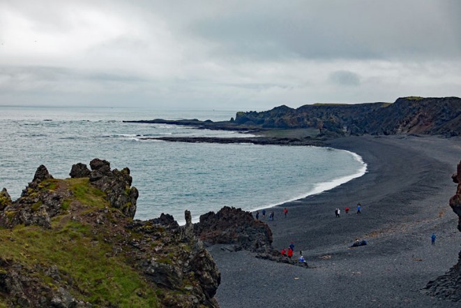 Glücklicherweise bahnt sich eine Stunde später auf unserer Busfahrt an der Nordküste der Halbinsel entlang die Sonne ihren Weg durch die dunklen Wolken und es wird heller. Den ersten schönen Spaziergang durch die schroffen Lavafelsen zum Strand machen wir im Naturpark vom Snaefellsjökull, wo wir nach Dritvik hinunterklettern und die Wellen an den schwarzen Strand heranrollen sehen.