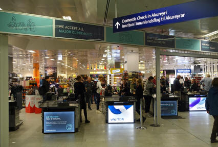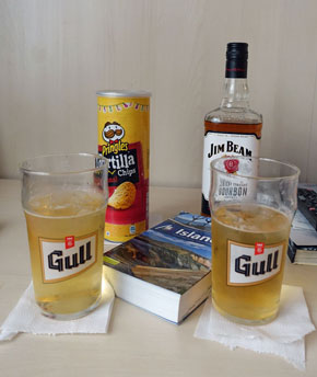 Die Koffer sind relativ schnell auf dem Gepäckband und meine Frau geht derweil in den Duty Free Shop und kauft eine Flasche Jim Beam für unsere tägliche Happy Hour. Das war ein guter Tipp aus unserem gedruckten Reiseführer aus dem Michael Müller Verlag, den ich nur unterstreichen kann: Kaufen Sie unbedingt direkt nach der Landung im Flughafen die alkoholischen Getränke ein, denn die sind in Island unverschämt teuer! Für die 1 l -Flasche Whiskey bezahlten wir hier umgerechnet 18 Euro, während die 0,7 l -Flasche im staatlichen "Vinbudin" (= Weinbude) 56 Euro kostet! Wie das mit anderen Sachen ist, weiß ich nicht, aber wahrscheinlich sollte man sich im Duty Free Shop damit eindecken.