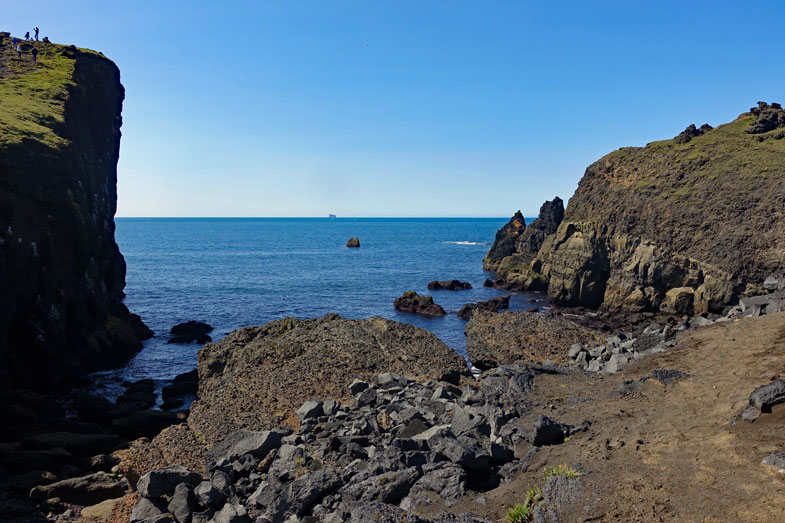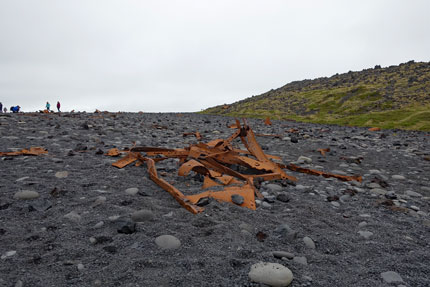 In der Bucht liegen Wrackteile von gestrandeten Schiffen, denn der Nordatlantik hat nämlich im Winter unbarmherzige Wellen. Vom 16. bis 19. Jahrhundert war diese Bucht, die links und rechts von Lavafelsen eingerahmt wird, die größte und ergiebigste Fischanlandestation Islands. In den Monaten von April bis Mitte ruderten hier täglich 40 - 60 Fischerboote aufs Meer und bis zu 800 Männer wohnten in Hütten hier am Strand.