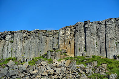 Hier machen wir unseren ersten Fotostopp an den Basaltfelsen der Gerduberg-Cliffs.Solche Basaltstrukturen sind typisch für die erkaltende Lava nach Vulkanausbrüchen und sind auch die grundlegende Idee für die Hallgrimskirche in Reykjavik gewesen. Uns interessiert das gar nicht so sehr, denn vielmehr freuen wir uns über den blauen Himmel dahinter und dass es nicht regnet.
