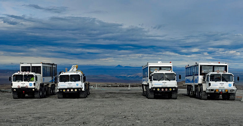 Dadurch haben sie die fünffache Auflagefläche und können sich relativ sicher auf dem Gletschereis fortbewegen. Wenn kein Eis vorhanden ist und die Strecke über Lavabrocken oder Geröll führt, wird einfach während der Fahrt der Luftdruck erhöht und man hat wieder ein Geländefahrzeug.