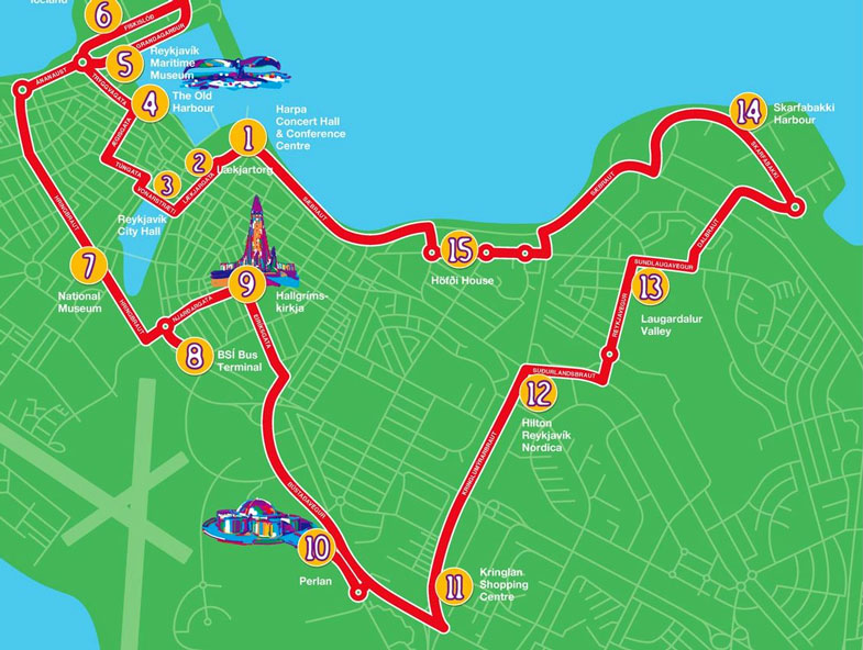 Diese Karte bekommen Sie in den meisten Hotels oder auch im Internet auf www.mapofreykjavik.is. Blau markiert ist auf dem Stadtplan die Fußgängerzone Die rot eingezeichnete Linie ist die Fahrtroute der Hop-on Hop-off Busse. Besser sind natürlich die Haltepunkte auf der Karte zu sehen, die die Firma City Sightseeing im Internet anbietet.