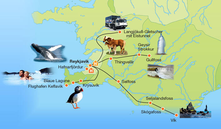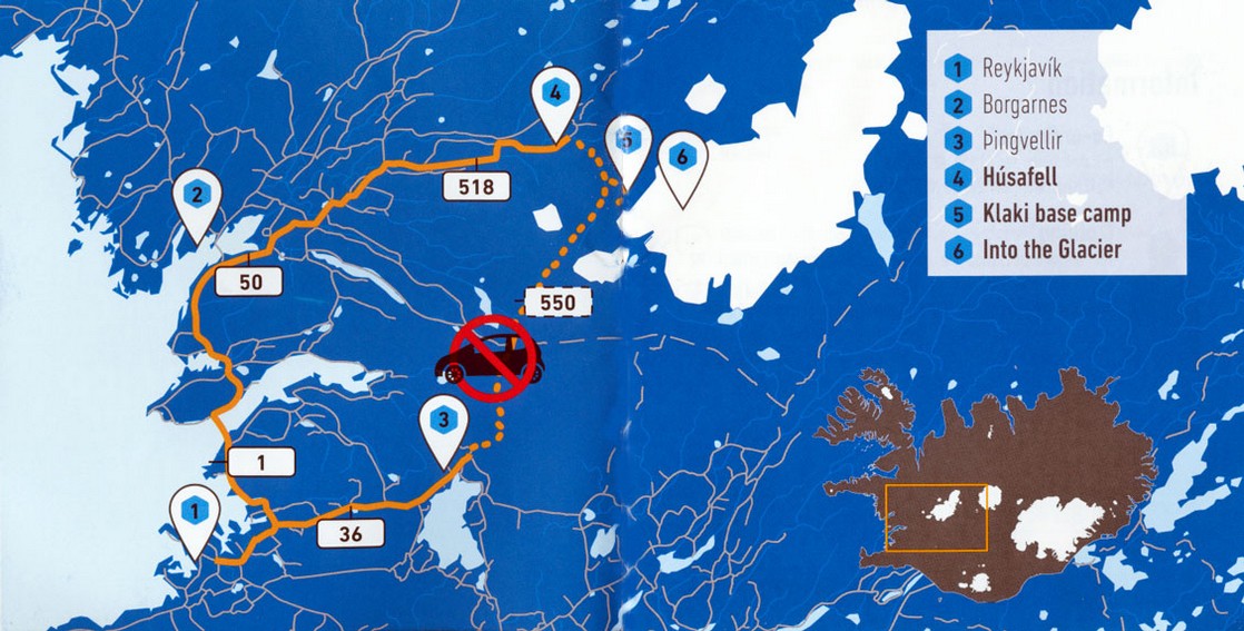 Schon um 7:15 Uhr steht der Bus vor der Tür zu unserem heutigen Ausflug "Westisland - weiße Gletscher und schwarze Lavawüsten. Hier ist die Karte von der Firma Into the Glacier, die das organisiert: