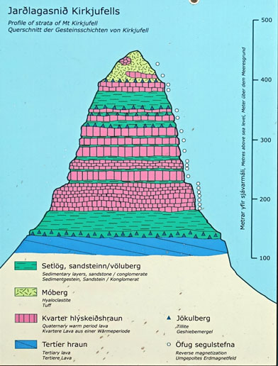 Der obere Teil des Berges ist während der letzten Million Jahre entstanden und besteht sowohl aus Lavaschichten, die in Wärmeperioden entstanden, wie auch aus Tuffstein, der in Kälteperioden durch Vulkanausbrüche unter dem Eiszeitgletscher entstand. Der Kirkjufell bekam seine heutige Form durch Gletschererosion während der zweiten Hälfte der Eiszeit. In Island gibt es nur wenige so klare Beispiele von Gletschererosion.