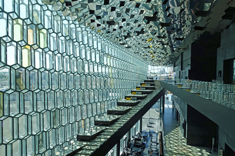 Schließlich steigen wir an der Harpa Konzerthalle aus. Das 43 m hohe Gebäude besteht aus quaderförmigen Teilen und hat als Besonderheit eine wabenartige Umhüllung aus unterschiedlich beschichteten Gläsern, die je nach Sonneneinfall in verschiedenen Farben leuchten.Die Konzerthalle hat interessante Geschichte, denn zunächst einmal wurde die äußere Gestaltung durch den isländischen Künstler Ólafur Elíasson entworfen, der versucht hat, die isländischen Lichtstimmungen dort erscheinen zu lassen.