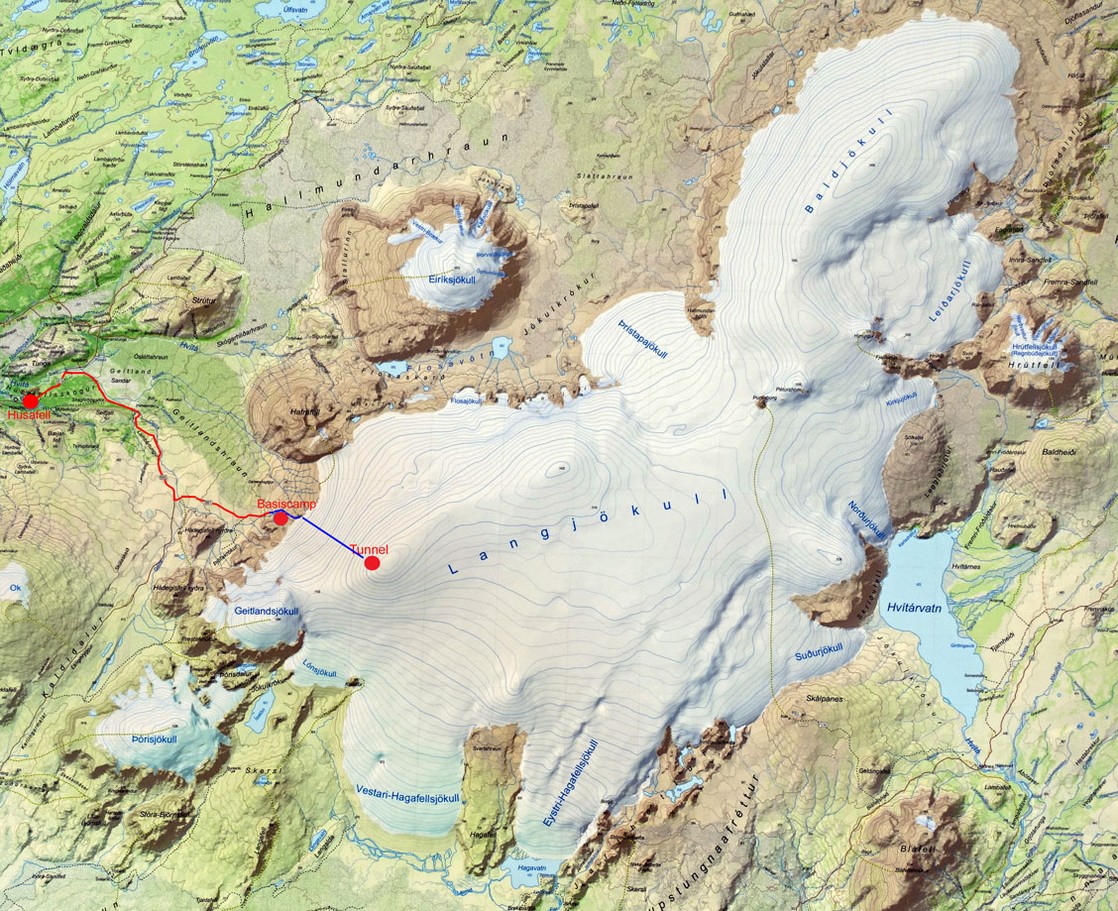 Während der langsamen und ruckelnden Fahrt müssen wir uns alle anschnallen und das Fahrzeug wird von außen durch den Fahrer verriegelt. Der begleitende Ranger erklärt uns die Situation am Langjökull-Gletscher, auf dem wir uns befinden. Es ist mit einer Ausdehnung von 950 km² der zweitgrößte Gletscher Islands und sein Eis ist über 500 m dick.