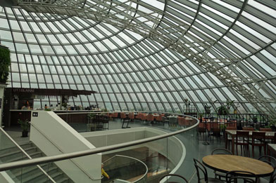 Das ist eine Aussichtskuppel, die über vier riesigen Wassertanks errichtet wurde und sich zum zweiten touristischen Wahrzeichen der Stadt entwickelte. Von oben soll man einen fantastischen 360° Rundumblick über die Stadt Reykjavik und das Umland haben. Aus dem Innern der Kuppel heraus ist nicht viel zu sehen, weil es regnet und die Regentropfen auf den schrägen Scheiben die Sicht unmöglich machen.