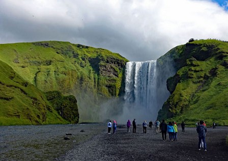 Schon um 8:00 Uhr starten wir zur Südküste mit 25 Personen in einem sehr bequemen Reisebus. Wir scheinen Glück mit dem Wetter zu haben, denn es sind einige Sonnenstrahlen zu sehen, während die Temperatur noch bei 10 °C liegt. Reiseführerin Angelika erzählt sehr anschaulich etwas aus der Geschichte der ersten Besiedlung Islands. Und natürlich die blutige Saga von Njals und dem schönen Gunnar mit seiner rachsüchtigen Ehefrau. Die isländischen Sagen sind auch heute noch Stoff für Romane, Theaterstücke oder Filme. Es gibt sie auch als deutsche Übersetzung im Internet.Die Fahrt an der Südküste entlang über die Landstraße Nr. 1 geht durch grüne Wiesen, auf denen Schafe und Pferde weiden. Im Hintergrund ist der Eyjafjallajökull zu sehen, der bei seinem Ausbruch 2010 die gesamte Umgebung mit einem Ascheregen überzogen hat. Damals ist sogar der gesamte Luftverkehr über Europa davon betroffen gewesen. Angelika erzählt aus eigener Anschauung, was um den Berg herum los gewesen ist.