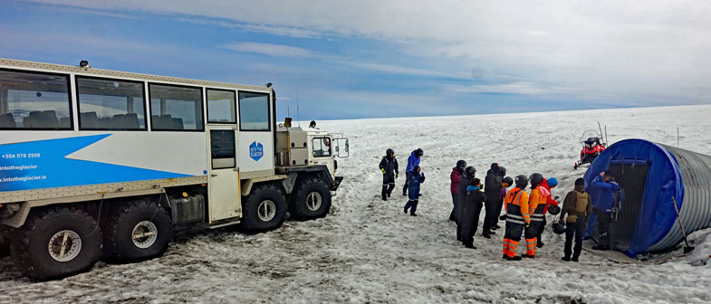 Dadurch haben sie die fünffache Auflagefläche und können sich relativ sicher auf dem Gletschereis fortbewegen. Wenn kein Eis vorhanden ist und die Strecke über Lavabrocken oder Geröll führt, wird einfach während der Fahrt der Luftdruck erhöht und man hat wieder ein Geländefahrzeug. Im Basiscamp können wir uns etwas aufwärmen, weil wir auch noch warten müssen, denn eine andere Gruppe ist noch vor uns an der Reihe. Wir können uns jeweils passende wasserdichte Überziehschuhe aussuchen, weil jetzt während der Sommerzeit viel Schmelzwasser im Gletscher entsteht und die Gänge ziemlich nass sind.